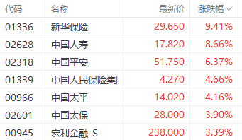 保险股中,新华保险(01336.HK)、中国平安(02318.HK)、中国太平(00996.HK)分别上涨9.41%、8.66%、6.37%。