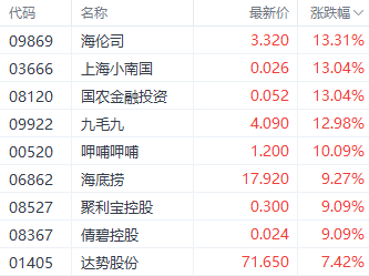 餐饮股中,海伦司(09869.HK)、九毛九(09922.HK)、海底捞(06862.HK)分别上涨13.31%、12.98%、9.27%。