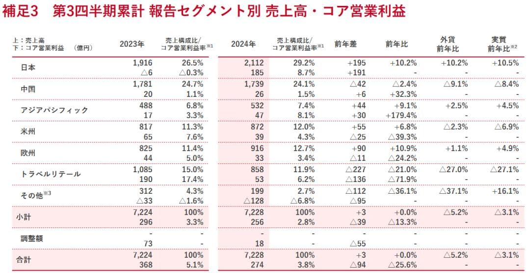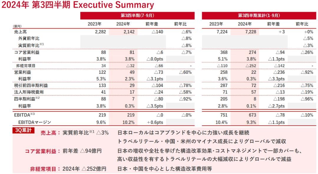 其中,2024年Q3销售额为2142亿日元(约合人民币100亿元),同比下滑6%;核心营业利润为81亿日元(约合人民币4亿元),下跌7%;营业利润下降60%。