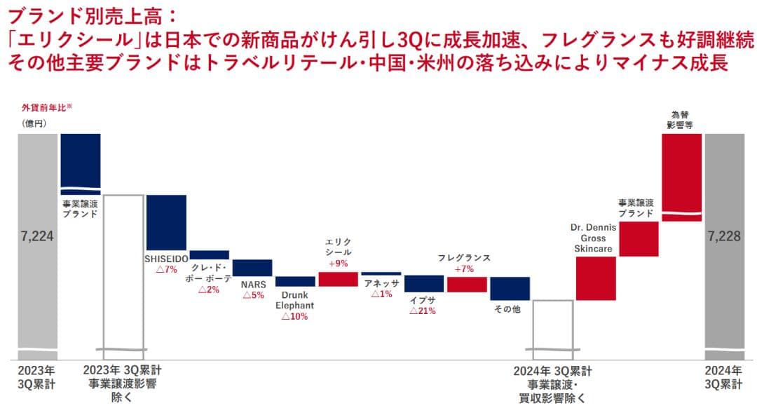 资生堂集团在财报中指出,在2024年累计的前三季度中,地缘政治风险高涨、物价高涨、汇率波动上升等带来的前景不确定性持续存在。中国经济增长减速,且欧洲持续缓慢增长。虽然经济稳步发展,但个人消费势头有所减弱,因此,对未来的警戒感要提高。