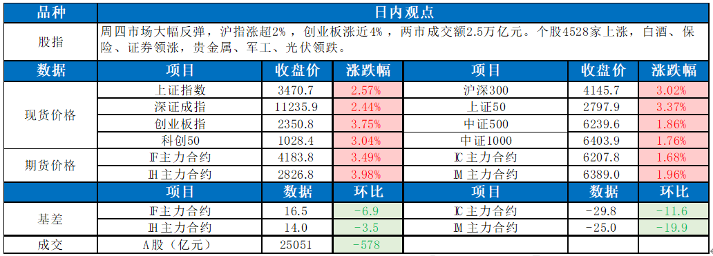 周四市场大幅反弹,市场情绪好转,沪指涨超2%,创业板涨近4%,两市成交额2.5万亿元。个股4528家上涨,白酒、保险、证券领涨,贵金属、军工、光伏领跌。截至收盘,上证指数报3470.66点,涨2.57%;深证成指报11235.92点,涨2.44%;创业板指报2350.76点,涨3.75%;沪深300报4145.70点,涨3.02%;上证50报2797.86点,涨3.37%;中证500报6239.56点,涨1.86%;中证1000报6403.92点,涨1.76%。
