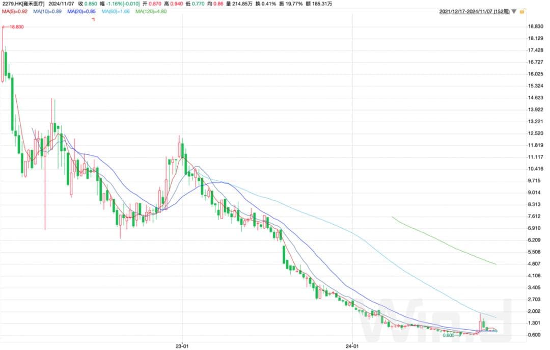 但在此之前,雍禾医疗的股价一度经历了长期且惨烈的下跌。2021年末,雍禾医疗上市发行价为15.8港元/股,上市后第5个交易日即站上历史高点(19港元/股),可谓开局即巅峰;之后股价便进入了长期下跌通道,到今年8月23日盘中历史低点,其股价下探至0.6港元/股。
