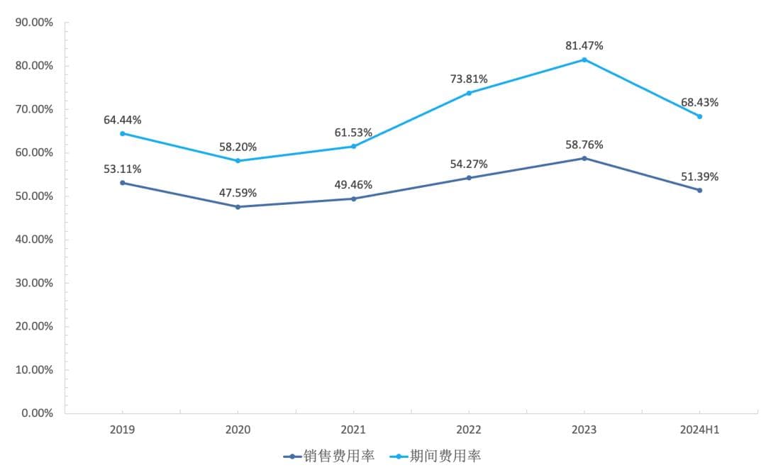 净利润方面,在收入高光的2021年却出现净利润负增长,进入2022年后公司净利润一直亏损。关于负增/亏损的主要原因:一方面是受疫情、经济弱复苏等因素影响导致的收入缩水;另一方面则是受到了公司在2022、2023年战略扩张的影响,由此导致盈利能力走弱、毛利明显收窄,叠加期间费用维持在较高的强度水平上,最终侵蚀了过多利润,比如2023年的销售费用超过了同期毛利,2022年和2024年中期的期间费用合计也超过了同期毛利。