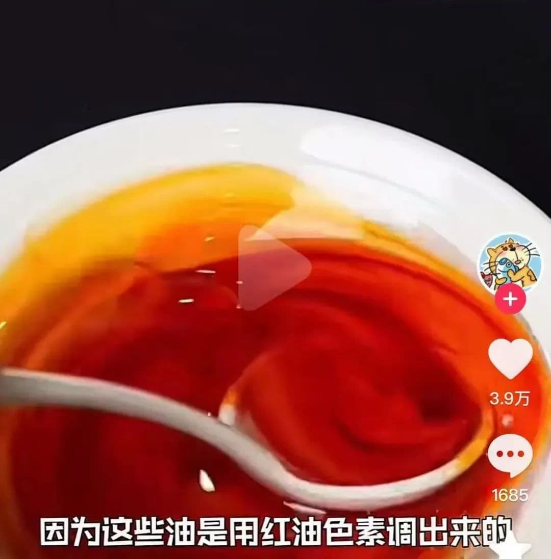 部分商家会在色拉油中滴一点红油色素,从视觉上确实是瞬间变成了辣椒油,但是它只红不辣,这就是为什么有些外卖又油又腻,看着鲜红明亮但吃着不辣了。