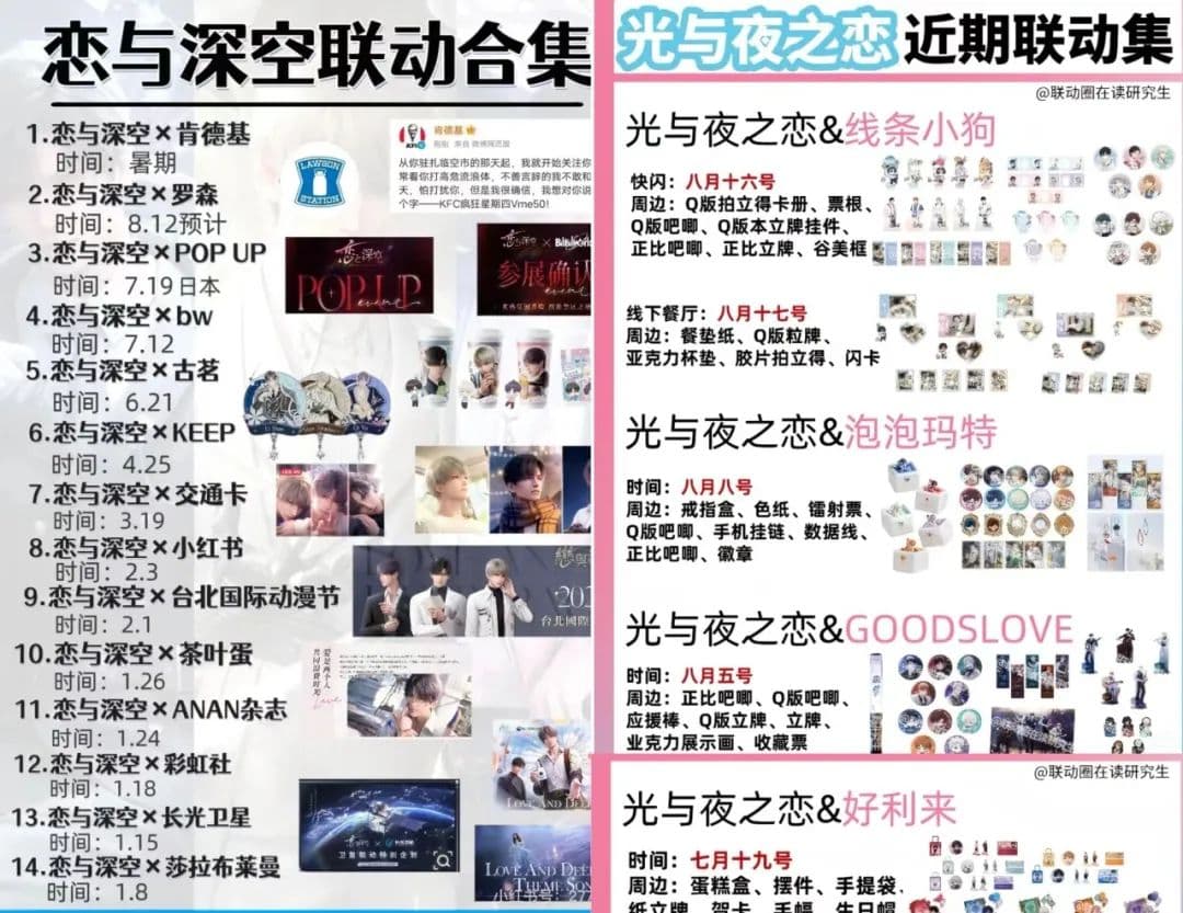 如此火爆的联名数不胜数,8月,罗森和《恋与深空》联名,12块的徽章一周卖掉了超170万份的周边;7月,好利来和《光与夜之恋》联名,其为游戏内五位男主角分别定制了五款不同口味的蛋糕和五款不同口味的半熟芝士,上线就卖爆;6月,古茗和《恋与深空》联名,20分钟直接售罄;3月,喜茶和《光与夜之恋》联名,奶茶店的单子直接变门帘……