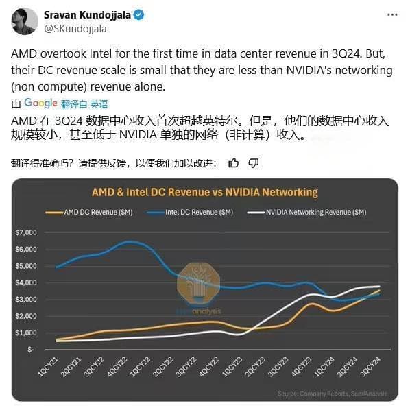 日前AMD公布的财报数据显示,2024年第三季度AMD数据中心业务营收达到了35.49亿美元,略高于Intel的33亿美元,首次实现了对Intel的超越。从X网友公布的营收曲线图可以看到,在此之前,NVIDIA已在数据中心业务方面超越了Intel,如今AMD同样如此,Intel的衰落肉眼可见。