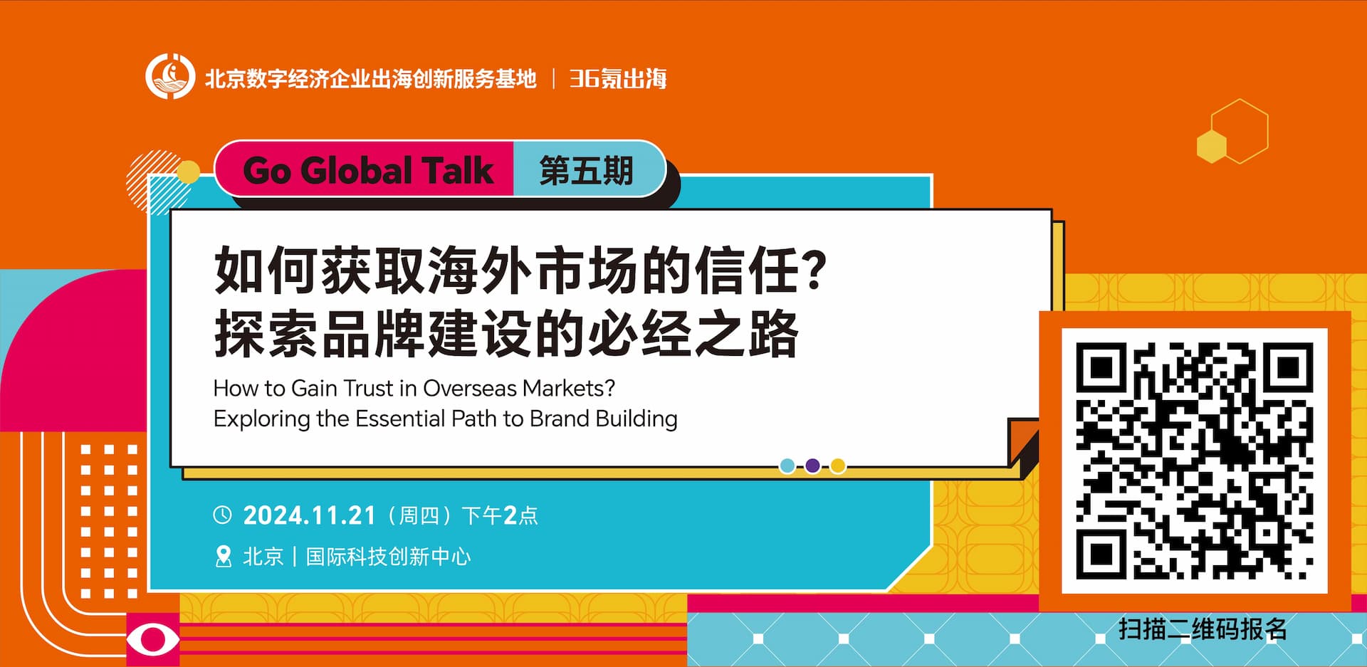 如何在海外市场打造具有影响力的品牌,正成为众多出海企业的必答题,而解题的关键在于深入洞察目标市场的本地化需求、清晰地传递品牌理念及价值,并通过与用户的持续互动获取长久的信任。在此背景下,36氪出海将于11月21日下午2:00在北京举办主题交流活动。此次活动特邀来自 XREAL、Renata LLC 和 TikTok for Business 的重磅嘉宾,他们将基于丰富的品牌出海经验。分享在国际化与本地化品牌建设中的深刻见解。通过分析成功出海品牌的案例,并结合最新的市场营销趋势,为志在全球化的企业提供极具价值的品牌策略参考。如果您关注出海企业的全球化品牌策略,希望深入探讨出海品牌建设之道,欢迎您扫描下方二维码填写表单,报名参加活动。活动报名将于11月20日中午12:00截止。