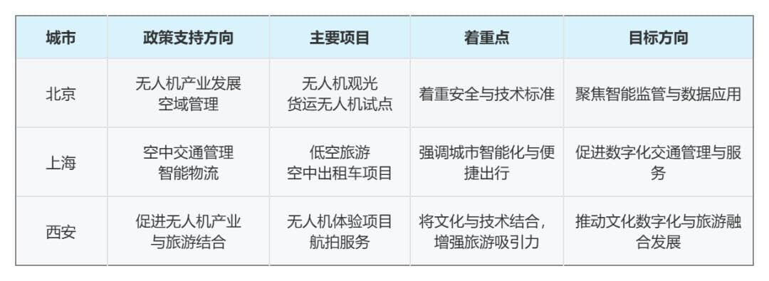 政策的密集出台为低空经济、特别是低空旅游的蓬勃发展奠定了坚实的基础。《关于组织开展2024年实体经济和数字经济深度融合典型案例征集工作的通知》等政策进一步鼓励各地探索数字旅游新模式,加速旅游业的数字化转型,不同城市在政策支持下也逐渐形成了各具特色的发展策略。
