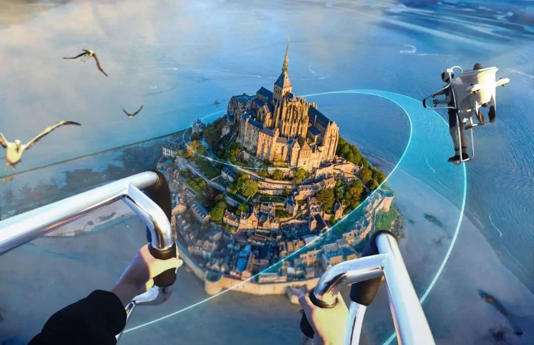 不同于坐在剧场内的飞行影院,飞越法国项目开创了VR 360视频结合体感科技的低空模拟飞行新体验,让每个人都有自主翱翔天空的机会。飞越法国是一种独特的沉浸式飞行穿越体验。由法国FlyView联合Backlight工作室、法国旅游局和国家文化遗产中心联合制作,利用全新360航拍技术和领先的沉浸式全感科技,使游客在22分钟内飞越法国的自然风光和文化遗产,体验真实的飞行感觉。
