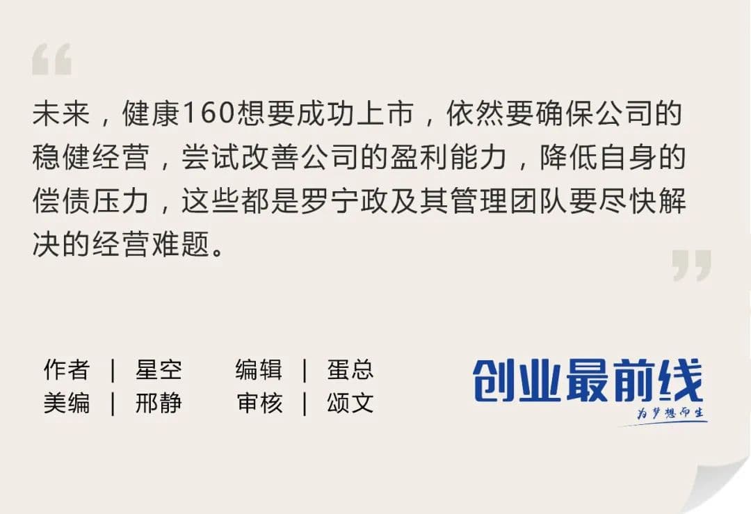 未来,健康160想要成功上市,依然要确保公司的稳健经营,尝试改善公司的盈利能力,降低自身的偿债压力,这些都是罗宁政及其管理团队要尽快解决的经营难题。
