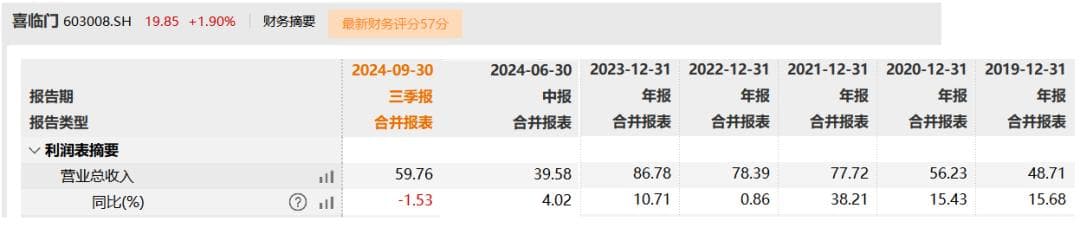 财报显示,2024年第三季度,喜临门实现营收20.19亿元,同比减少10.85%。这直接带动了整体营收的下滑,导致前三季度营收同比下滑1.53%至59.76亿元。