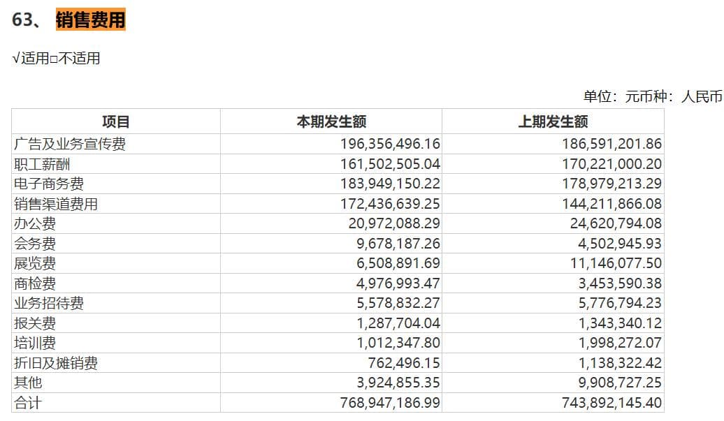 在2024年中期财报中,喜临门明确披露了销售费用的去向。2024年年上半年,广告及业务宣传费用1.96亿元、电子商务费1.84亿元、销售渠道费用1.72亿元,这三项合计约5.52亿元,几乎是当期归母净利润2.34亿元的2倍之多。