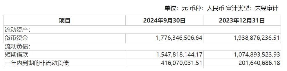 截至2024年9月30日,公司短期借款15.48亿元,较2023年底增长44%;一年内到期的非流动负债4.16亿元,较2023年底增长106%,这两项短期债务合计近20亿元。同期,其货币资金为17.76亿元,已经无法覆盖上述两项短期债务,资金压力由此可见一斑。