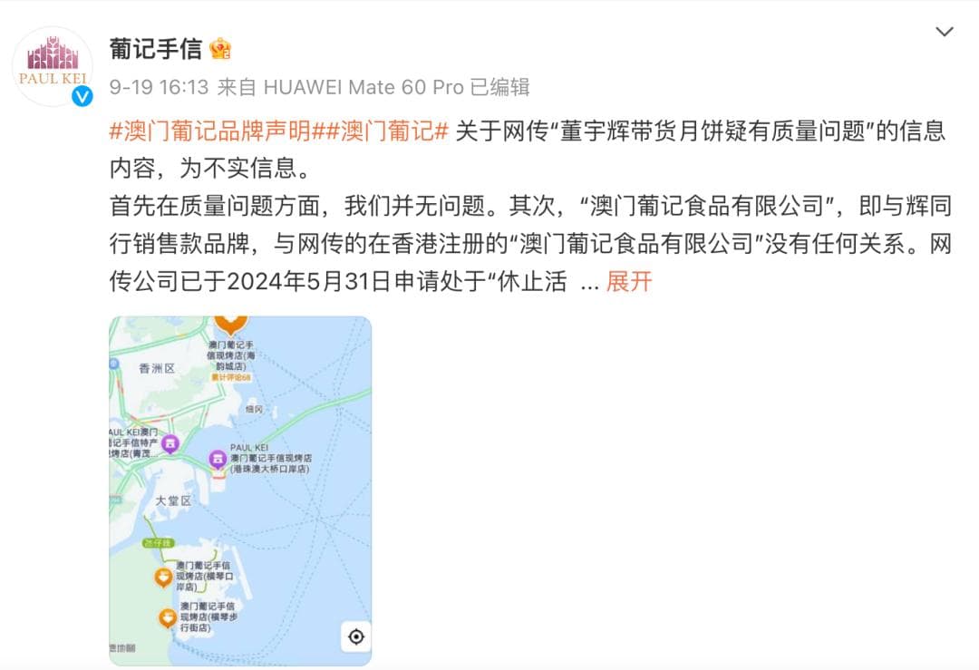 比如与辉同行直播间售卖的澳门葡记月饼,9月19日,微博账号“葡记手信”发布声明称,其公司产品没有问题,并且强调公司在中国澳门有真实有效的商标注册,且与珠海生产商有授权委托合同。