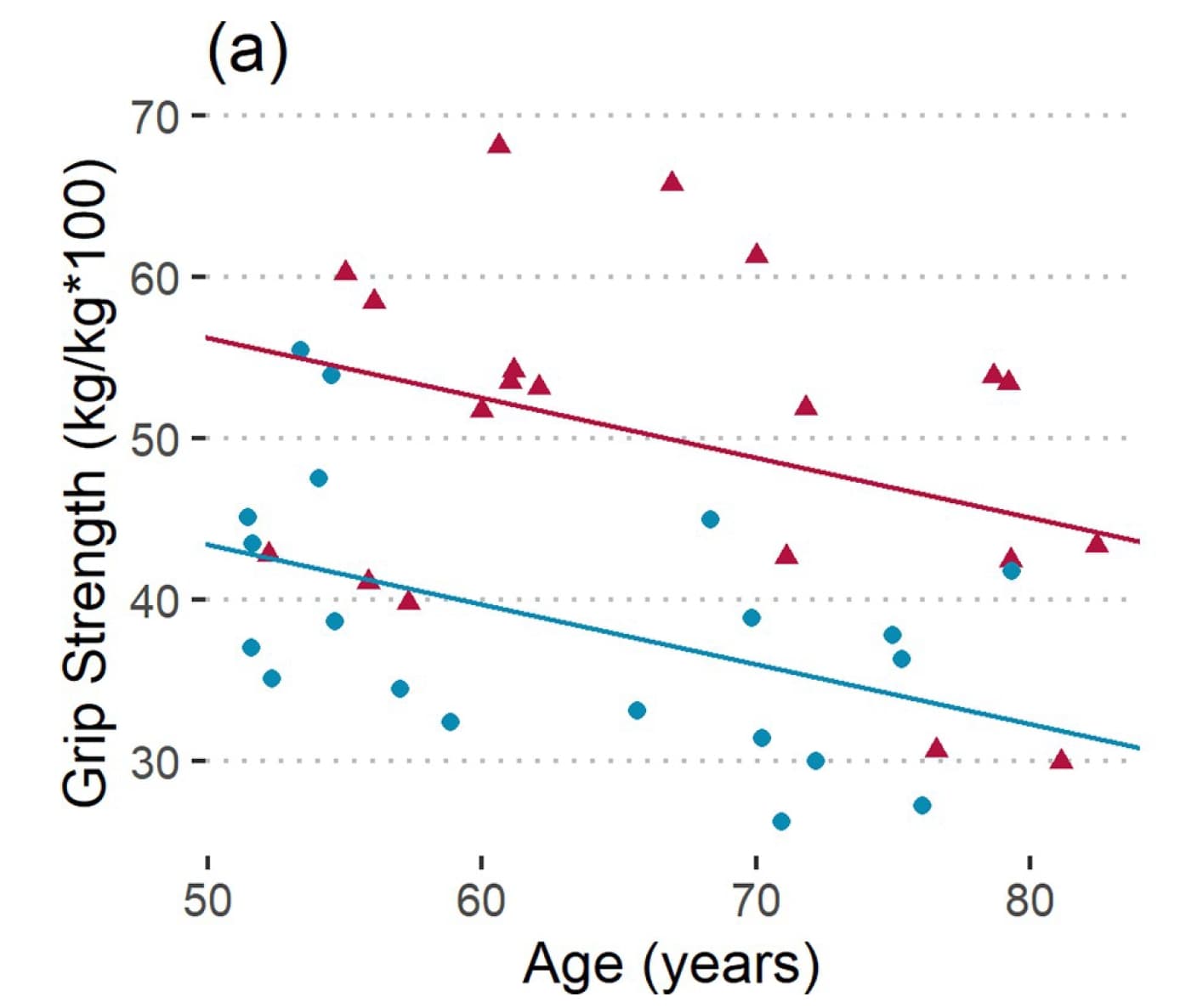 比方说,下图显示了握力与年龄的关系。握力是长寿研究的关注点,数据显示握力与年龄有微弱但显著的负相关。