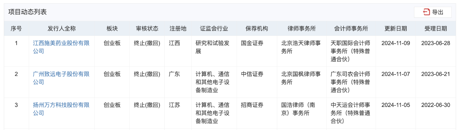 财联社11月10日讯(记者 赵昕睿)据深交所最新披露,正谋求创业板上市的施美药业于本周末终止审核。记者留意到,深交所本周终止审核的3家IPO均来自创业板,主动撤单为同一原因。除施美药业,另外2家IPO企业分别为致远电子和万方科技,分别由中信证券和招商证券保荐。
