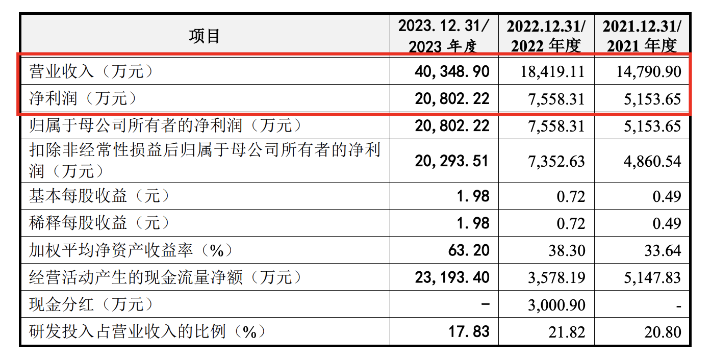持续经营能力方面,发行人在报告各期分别实现营收1.48亿元、1.84亿元和4.03亿元,年复合增长率为65.17%。净利润则分别实现0.52亿元、0.76亿元和2.08亿元,年复合增长率为100.91%。可以看到,2023的业绩表现大幅增长,但与此同时,占比较高的主营业务因毛利率下滑引发监管关注。