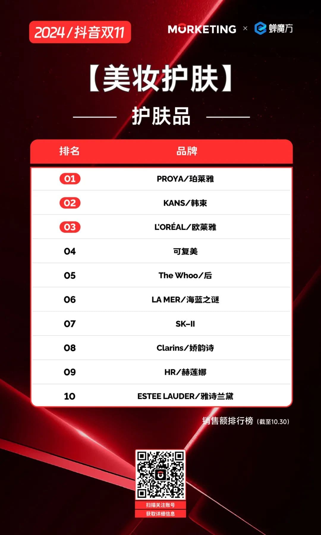 值得注意的是对比去年,今年双十一,SK-II、海蓝之谜、赫莲娜等一众贵价护肤品再次上榜。而去年登上总榜的极萌、觅光、雅萌等美容仪器,均未出现在总榜上,可见今年物理美容降温,美业焦点再次回归到了化学产品上,更细致来讲是聚焦在了护肤品。
