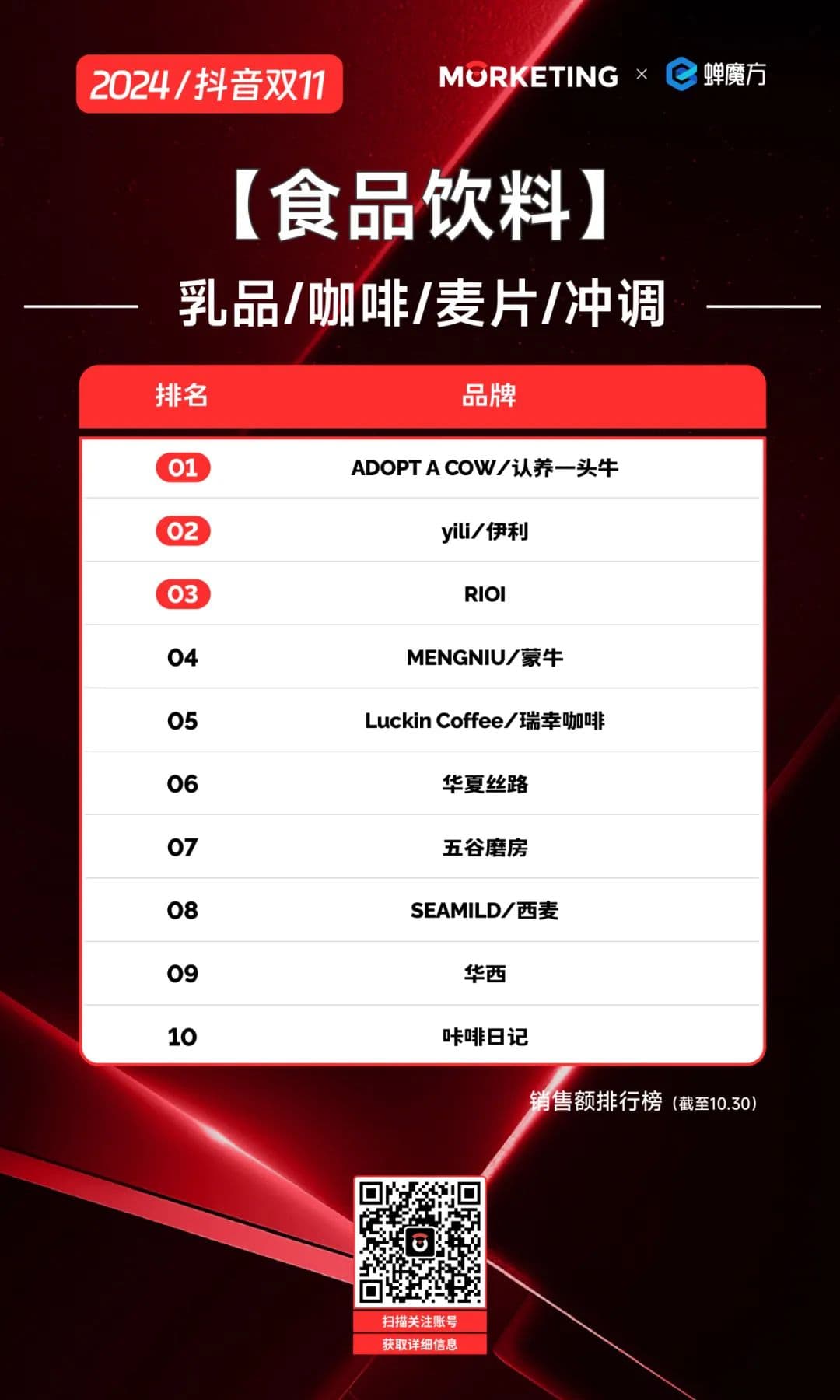 【乳品/咖啡/麦片/冲调】榜单的前五名分别是认养一头牛、伊利、RIOI、蒙牛、瑞幸咖啡。对比去年多家咖啡品牌登榜的盛况,今年即溶咖啡的热度显然已经降了下来。