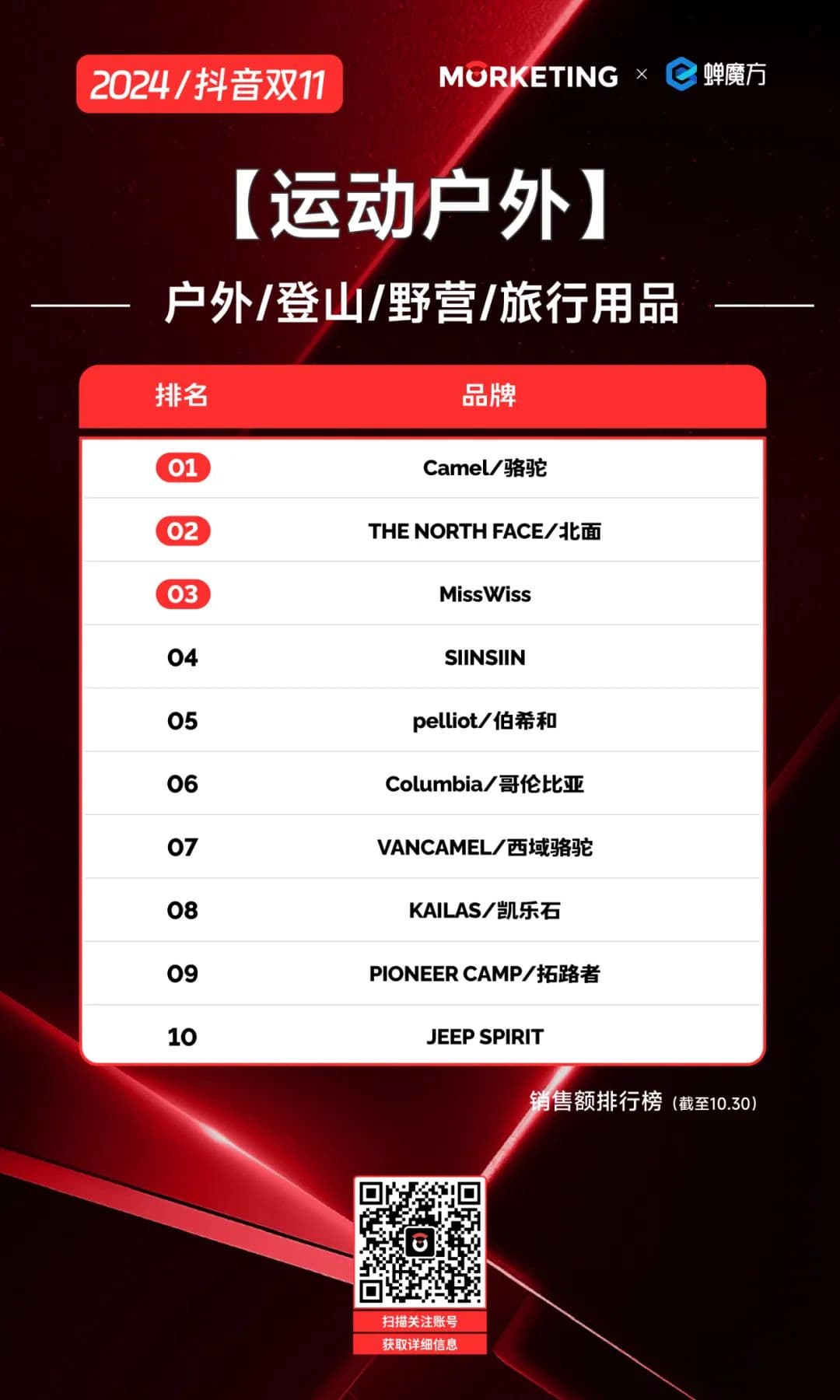 【户外/登山/野营/旅行用品】细分类目中,骆驼、北面均突破了5亿销售额大关。