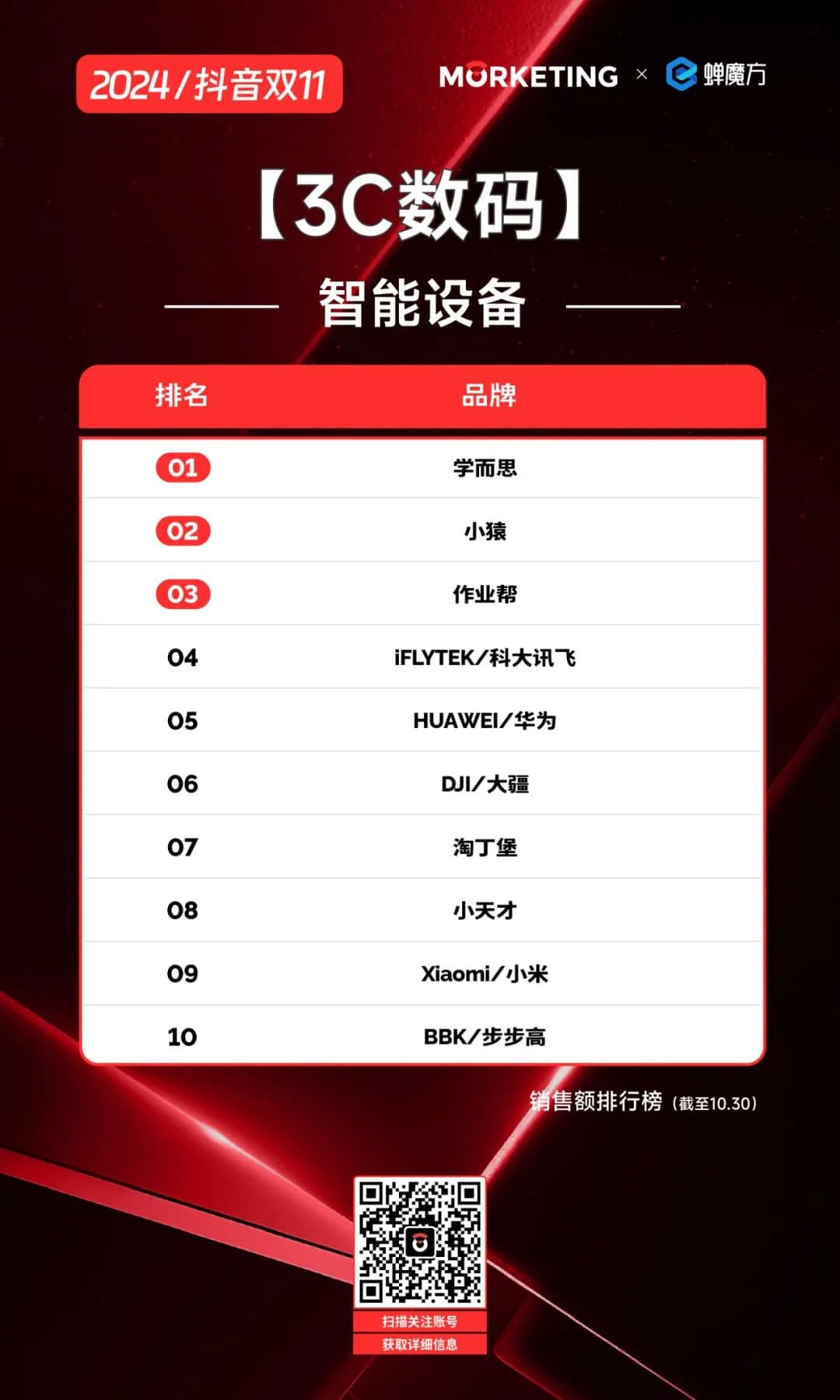 【3C数码】总榜中,华为、苹果、小米排名前三,销售额区间分别是10亿-25亿、7.5亿-10亿、7.5亿-10亿。学而思也凭借学习机占据了榜单第四名。