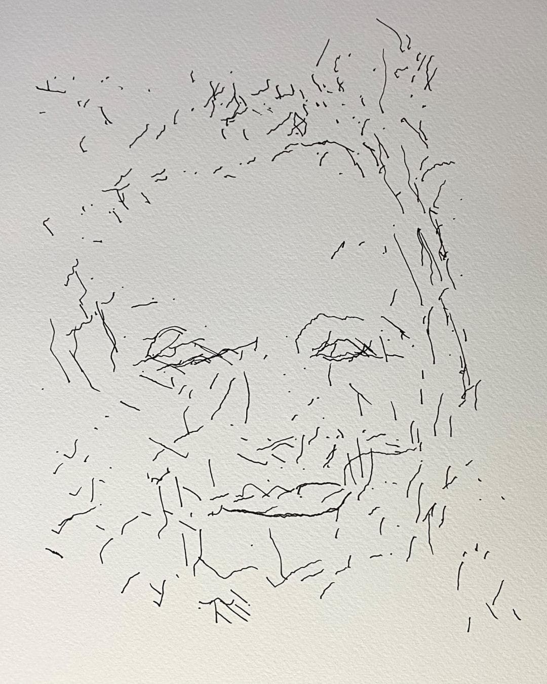 由于机械手臂的不灵活性,Ai-Da 的绘画过程通常从不连续的直线条开始,需要反复刷上大量笔触后才能看到主体轮廓,再在此基础上进行加工上色。