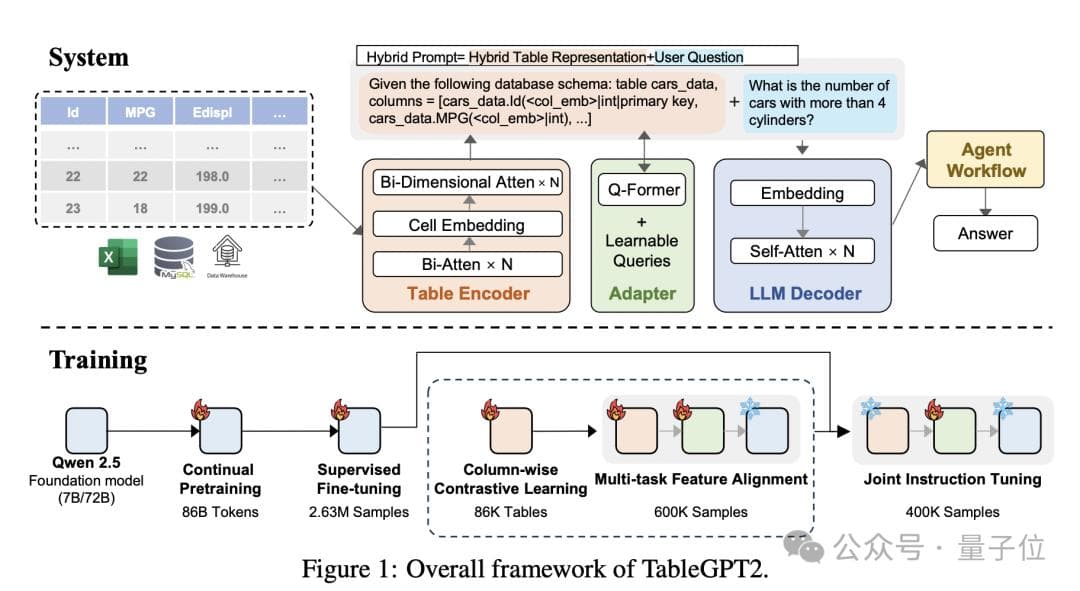 它基于Qwen2.5系列模型,使用超过860亿token进行预训练,给大模型喂入了超过59.38万张表和236万高质量的查询-表-输出样本,并创新性加入了一个表格编码器,专门用于读取和解释表格数据。