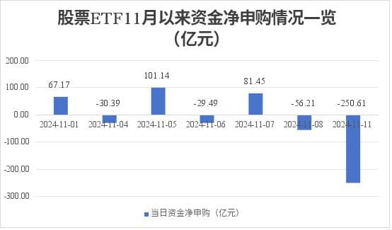 据银河证券基金研究中心数据统计,11月11日,股票ETF资金净流出超250亿元,创出2005年2月22日以来单日资金净流出的历史新高。11月以来的7个交易日资金累计净流出也超过百亿元。