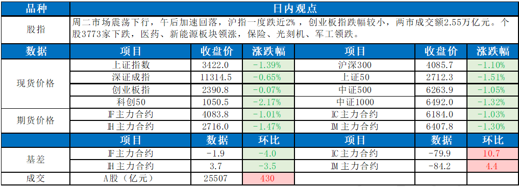 周二市场震荡下行,午后加速回落,沪指一度跌近2%,创业板指跌幅较小,两市成交额2.55万亿元。