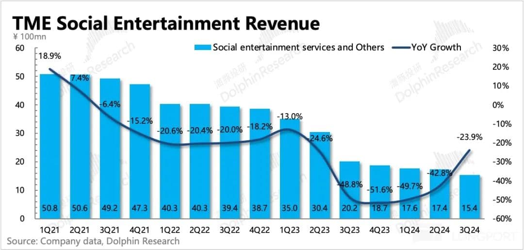 2. 直播加速走过调整阴霾:三季度社交娱乐正在慢慢走过调整阴霾,收入同比下滑 24%,开始明显收敛。社交娱乐的增长表现比市场预期稍微好一点,但腾讯音乐的核心逻辑早就已经切换到音乐订阅上,因此海豚君认为,社交娱乐的 beat 估计不太会给市场带来多少积极反应。
