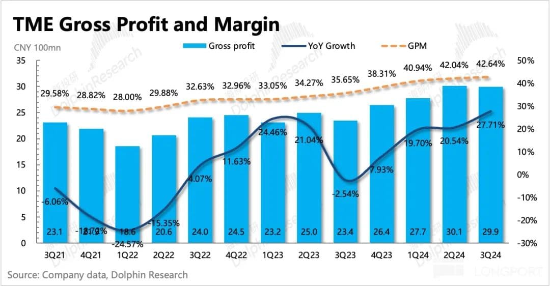 顺口一提,虽然整体盈利水平 inline,但结合低毛利率的社交音乐收入超预期的情况,隐含在线音乐的利润率水平应该海豚君粗略计算得在线音乐的毛利率环比继续提升,虽然提升幅度不大,但方向上还是体现了海豚君此前提及的,腾讯音乐可以利用产业链议价优势,对上游成本稳步优化的逻辑。