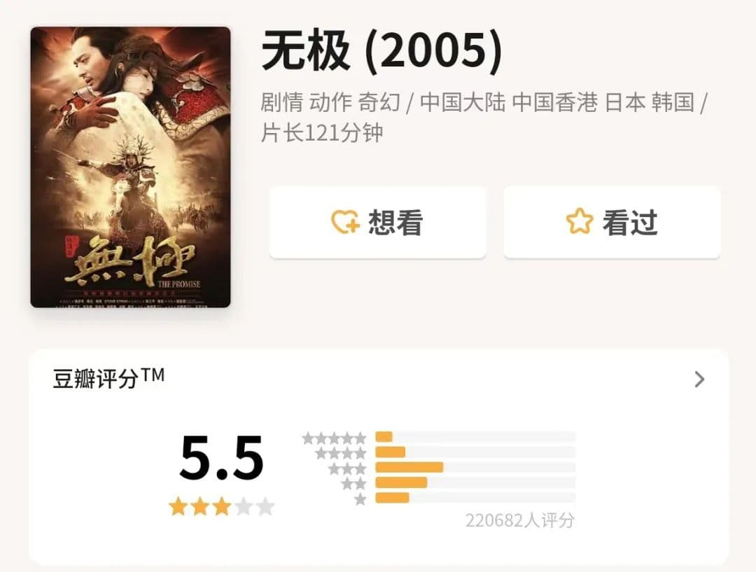 2005年《无极》上映时,因内容荒谬、逻辑不通,被打上“烂片”的标签,网友戏称为《一个馒头引发的血案》。