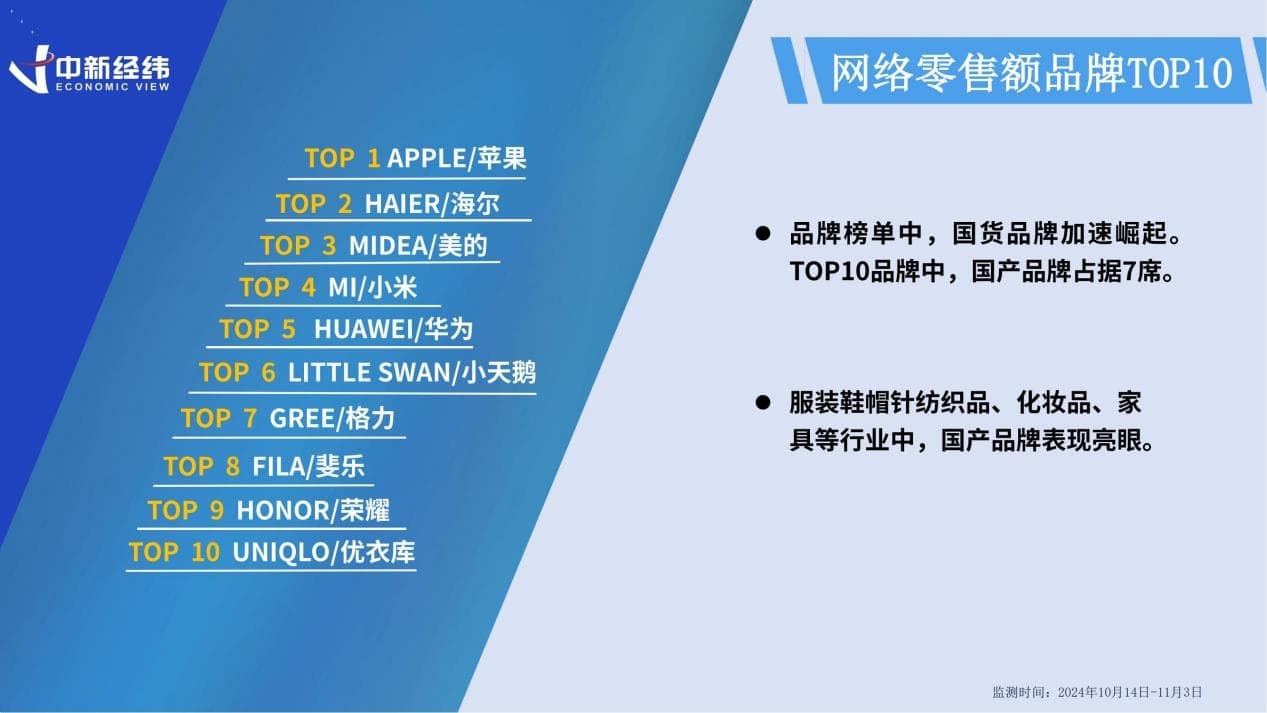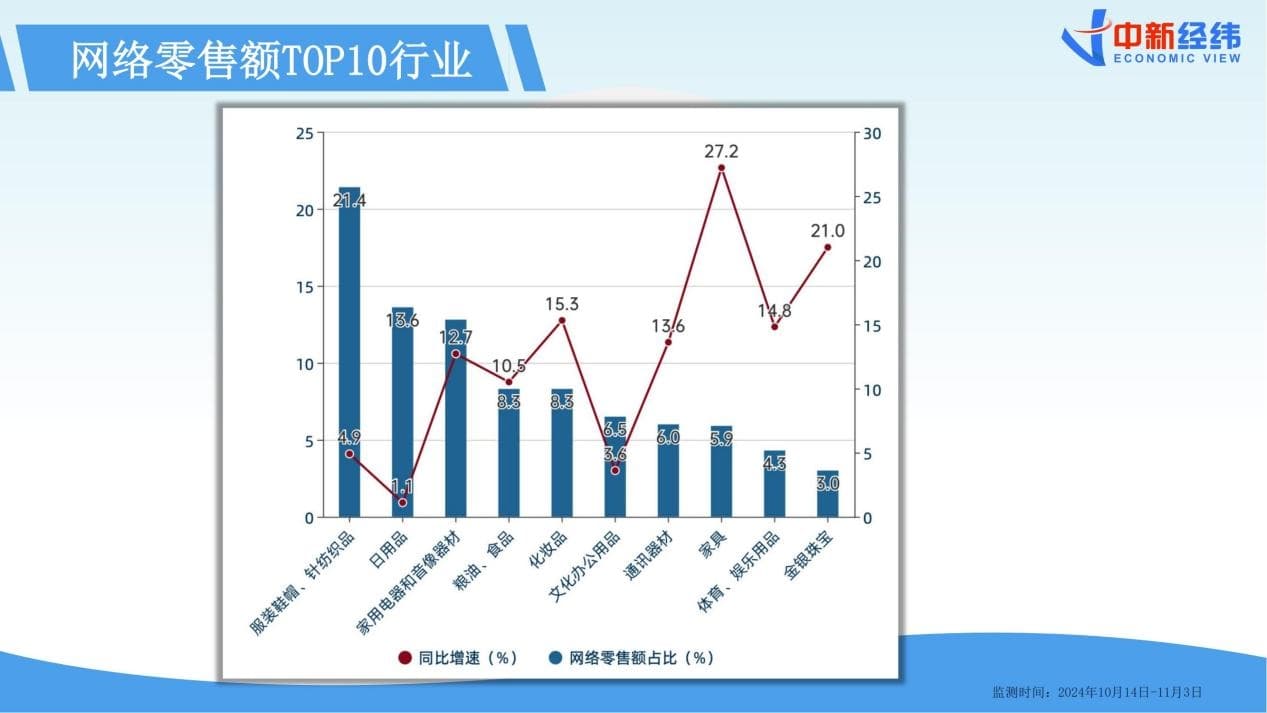 《报告》显示,2024年10月14日—11月11日,网络零售额超1.9万亿元,同比增速超8%。服装鞋帽针纺织品、日用品、家用电器和音像器材行业销售额位居前三。从主要平台销售占比来看,天猫、京东位居前两名。