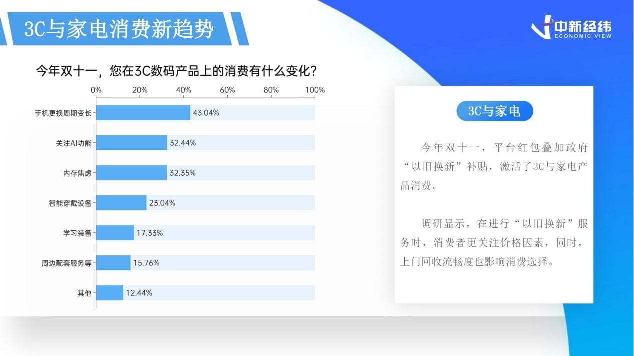 值得注意的是,除了电商平台的技术创新外,政府和平台的补贴支持也起到了重要的作用。《报告》指出,今年双十一以旧换新政府补贴力度十足。多地政府在国家统一规定的八大补贴品类外,还结合当地居民消费习惯、消费市场情况等,对投影仪、饮水机、空气净化器家电等品类进行补贴。这一政策的推出,使得消费者得到了更多实惠,提高了消费的积极性。结合平台“百亿”红包活动,补贴有效刺激了消费,加速了市场的活跃度。《报告》显示,京东的家用电器与3C数码品类销售额位居第一,均实现较高增速。