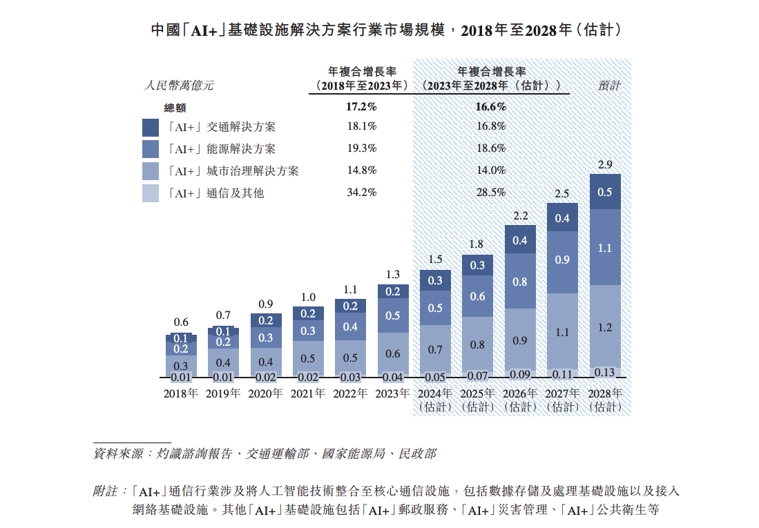 此外,灼识咨询的资料还显示,中国AI+基础设施解决方案行业稳步增长,市场规模从2018年的0.6万亿元扩大至2023年的约1.3万亿元,年复合增长率为17.2%。
