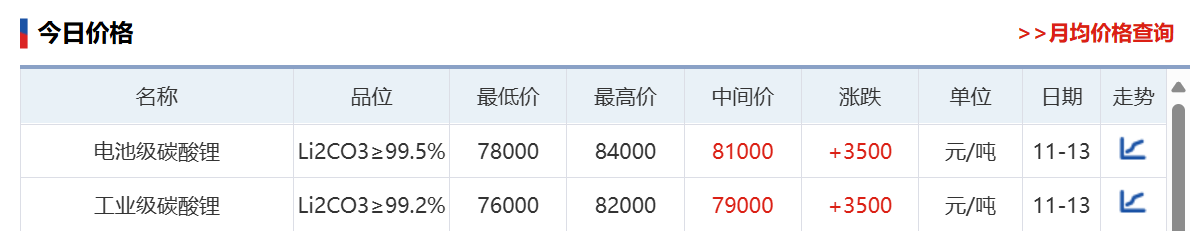 上海钢联发布数据显示,今日(11月13日)电池级碳酸锂价格较上日上涨3500元,均价报8.10万元/吨,自10月24日的低点价格7.15万元/吨以来,锂价持续强势上行。