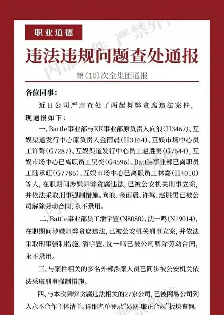 截止到目前公开消息,网易内部贪腐的已经有两宗案件浮出水面,涉及多名事业部及游戏发行线的负责人,总计9名员工因涉案已被采取刑事强制措施,其中有关联的27家供应商被列入永不合作的黑名单中。