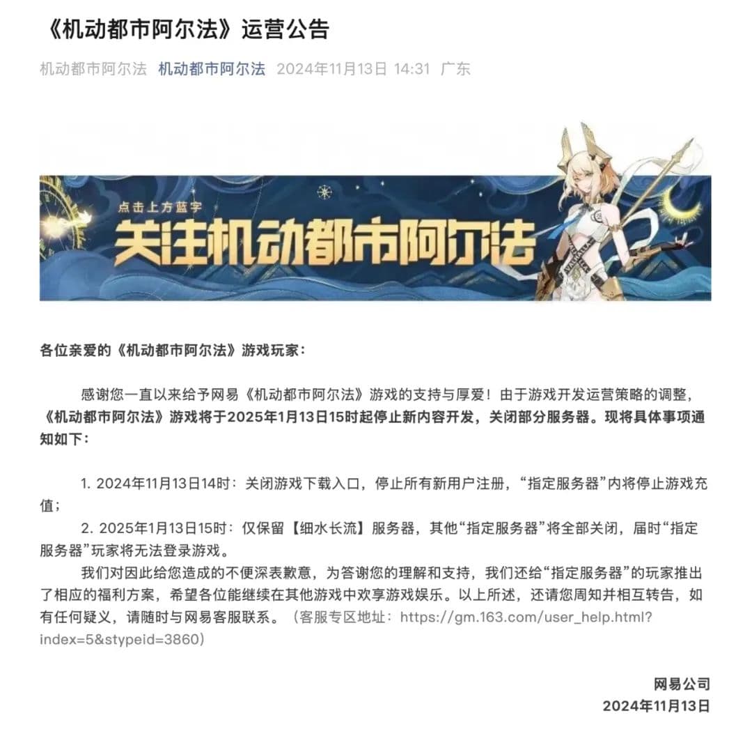 而今天下午网易旗下四款游戏《战争怒吼》(RTS手游)《泰亚史诗》(中世纪题材网游)《机动都市阿尔法》(机甲射击游戏)《宝可梦大探险》同时发布了停运公告,将在明年一月正式关服,仅保留一个服务器。