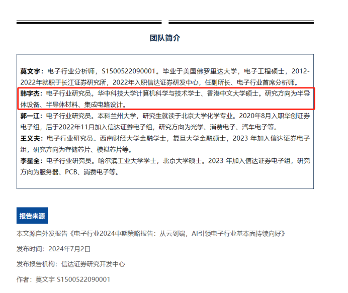 信达证券上海投资咨询分公司就是信达证券研究业务展业的经营主体之一,建立于2023年2月13日,在业内,券商通过投资咨询的分支机构进行研究业务展业较为普遍;罚单显示的个人韩字杰原为信达证券的电子研究员,研究方向为半导体设备、半导体材料、集成电路设计。中证协官网最新显示,已无韩字杰的注册执业信息。韩字杰最后一次署名的公开研报是今年7月发布的《电子行业2024中期策略报告:从云到端,AI引领电子行业基本面持续向好》半年度策略报告。