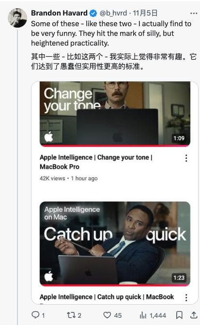 要知道,大家对苹果出品的 AI,期待还是很高的。人人都在等待着看,集成在强大硬件上的系统级 AI 到底能有多「天才」。这样几支广告出来,反而起到了预期管理的作用:可能也没有多天才,主打一些小机灵。