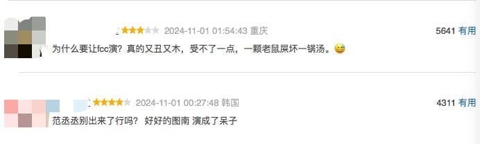 “受不了一点,一颗老鼠屎坏了一锅粥”、“范丞丞的演技还不如院子里吊着那几条蛇瓜”……豆瓣上“讨伐”范丞丞演技成为高赞短评的共性。更有人为导演张开宙唏嘘:“你的最高分电视剧被你的选角毁了!”