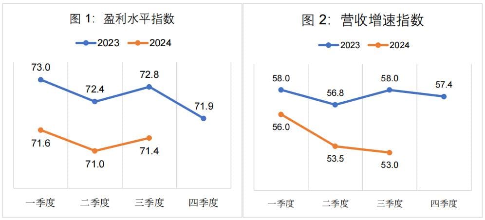 盈利水平止跌回升,营收增速跌幅趋缓。2024年三季度,样本企业盈利水平指数为71.4,较上季度微升0.4,结束连续三个季度下降的趋势,恢复到接近年初的水平(图1)。营收增速指数为53.0,较上季度微跌0.5,较去年同期的58.0下降5.0,显示增长停滞的情况仍未明显改观。两个指数继续处于50分界线上方(图 2),结束之前连续三个季度走低的趋势,出现企稳迹象。