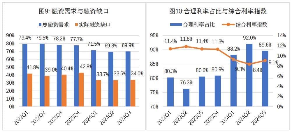 利率水平趋于合理、综合利率同比显著下降。2024年三季度,获得合理利率(年化利率低于15%)企业占有借贷企业比例为89.6%,较上季度的92.0%降低了2.4个百分点,主要受到5%以下低利率占比有所减少的影响;较去年同期的80.6%则上升9个百分点,利率水平趋于合理。有借贷企业的融资综合利率指数为9.1%,较上季度提高70个基点,较去年同期下降2.3个百分点,已经连续三个季度在10%以下,显示企业利息负担较2023年明显减轻(图10)。