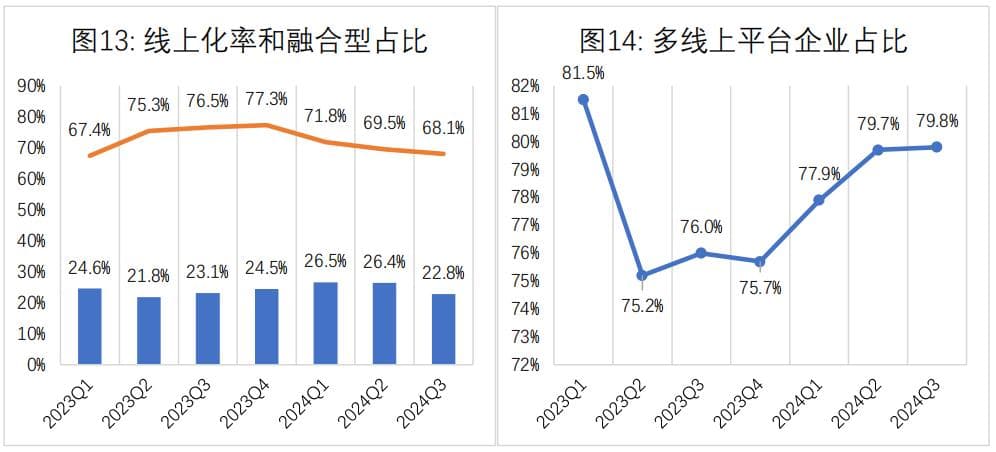 线上化率维持高位但连续两个季度回调。2024年三季度,样本企业线上化率(有线上门店企业占样本总数比重)为68.1%,较上季度的69.5%继续回调1.4个百分点,较去年同期的76.5%下降了8.4个百分点。在已线上化的样本企业中,融合型(超过30%的销售额来自线上)企业占比为22.8%,相比上季度的26.4%明显下降,减少了3.6个百分点,降至近五个季度的最低水平,显示线上销售的收入能力有所削弱(图13)。