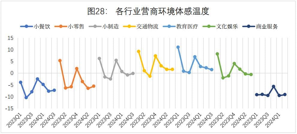 营商环境“体感温度”仍处于偏冷区间。我们将经营困难点和支持政策覆盖面组合起来,编制了样本营商环境的“体感温度”指数。指数取值范围在[-100, 100]之间,困难越少、政策支持越多,则温度越高、营商环境越友好,反之亦然。2024年三季度,“体感温度”指数为-2.8,较二季度的-3.5提升0.7度(图8)。虽然经营困难点覆盖面有所扩大,但政策支持力度同步增强,“体感温度”有所提升,但仍处于偏冷区间。