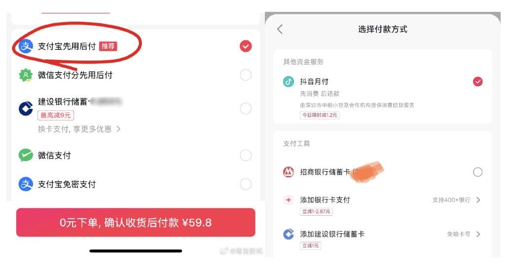 瞒天过海、暗度陈仓,是先用后付的第一招。它常常排在付款方式的第一顺位,并被预先勾选,配合“0元下单”的耸动文案或立减金额增加吸引力。如果下单时没有及时遏制大拇指一直点击下一步的肌肉惯性,或者压根儿没留意付款方式,先用后付很可能就这么用上了。