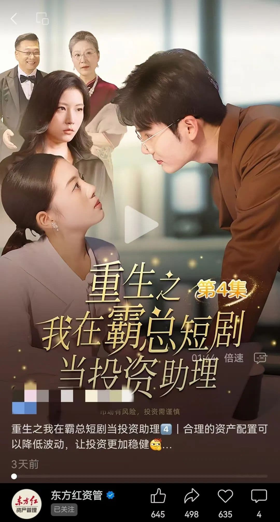 以东方红资管为例,该公司近期在抖音和视频号平台推出的《重生之我在霸总短剧当投资助理》,就是以短剧的形式对投资知识进行科普和宣传。从情节来看,“重生”的女主角穿越到顾氏家族企业担任投资助理职务,与担任市场部经理的女配角一起,向总裁汇报市场动态并提出投资建议。