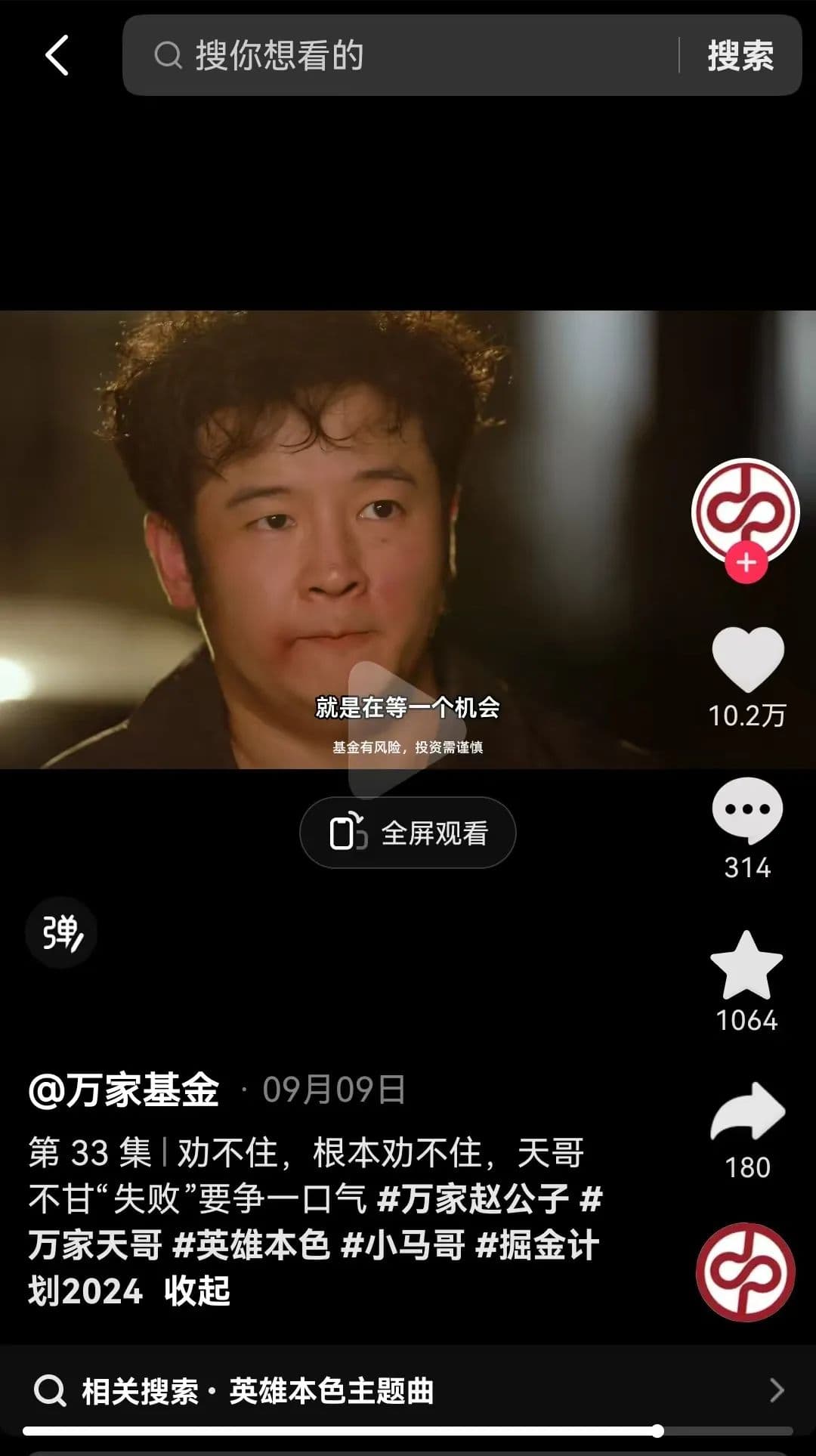 值得一提的是,部分基金公司还在拍摄短剧过程中“玩”出了新花样。2023年12月,万家基金通过翻拍经典电影《无间道》部分情节,推出了投资主题短剧,该剧在抖音平台获得了1.6万的点赞量;2024年,万家基金延续了这一思路,复刻了《繁花》《夏洛特烦恼》等经典影视作品部分剧情,其中翻拍《英雄本色》部分情节的短剧在抖音平台获得10.2万的点赞量。