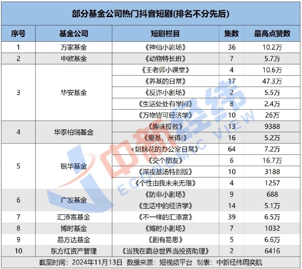 据中新经纬不完全统计,包括万家基金、中欧基金、华安基金、银华基金、广发基金等十余家机构在内,均在短视频平台推出短剧或微短剧系列视频,演绎风格包括沉浸式体验、夸张式表演等。
