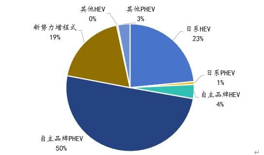 目前,日系合资品牌HEV、自主品牌PHEV和新势力增程式电动车,是我国混合动力市场中三个最具代表性的阵营。2023年1-10月,自主品牌PHEV(不含增程)占据整体混合动力市场的50%,其中日系HEV占据23%。增程式电动车虽兴起不久,但已迅速占领了19%的混合动力汽车市场份额。